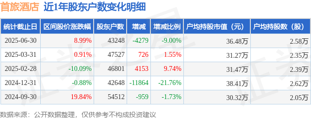 从股价来看,2025年3月31日至2025年6月30日,首旅酒店区间涨幅为8.99%,在此期间股东户数减少4279.0户,减幅为9.0%。
